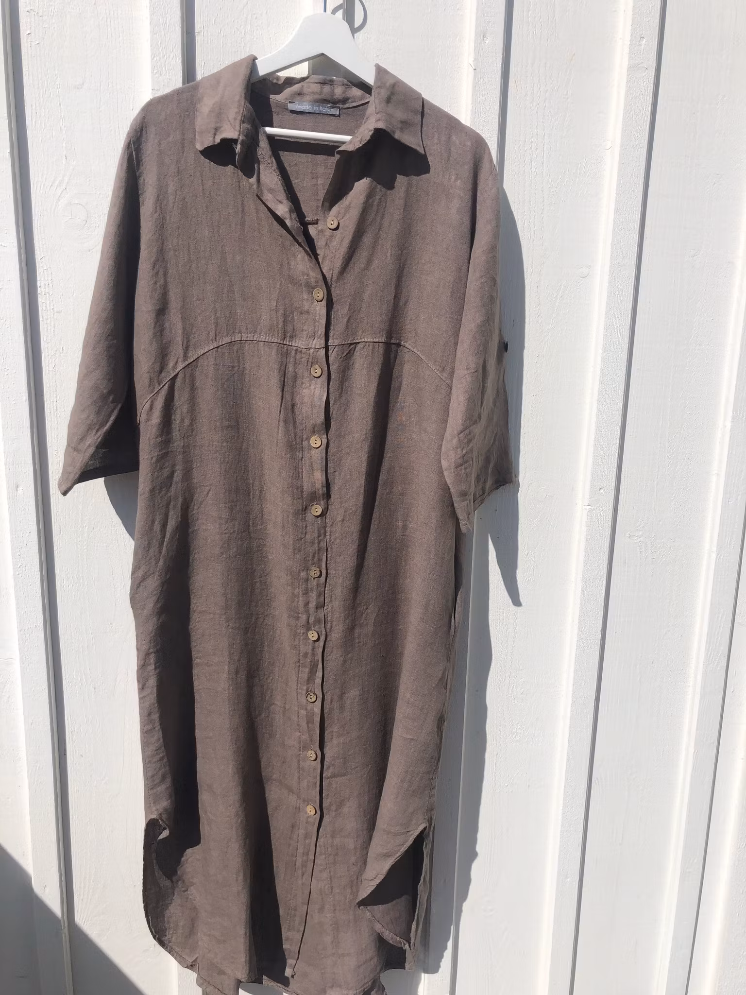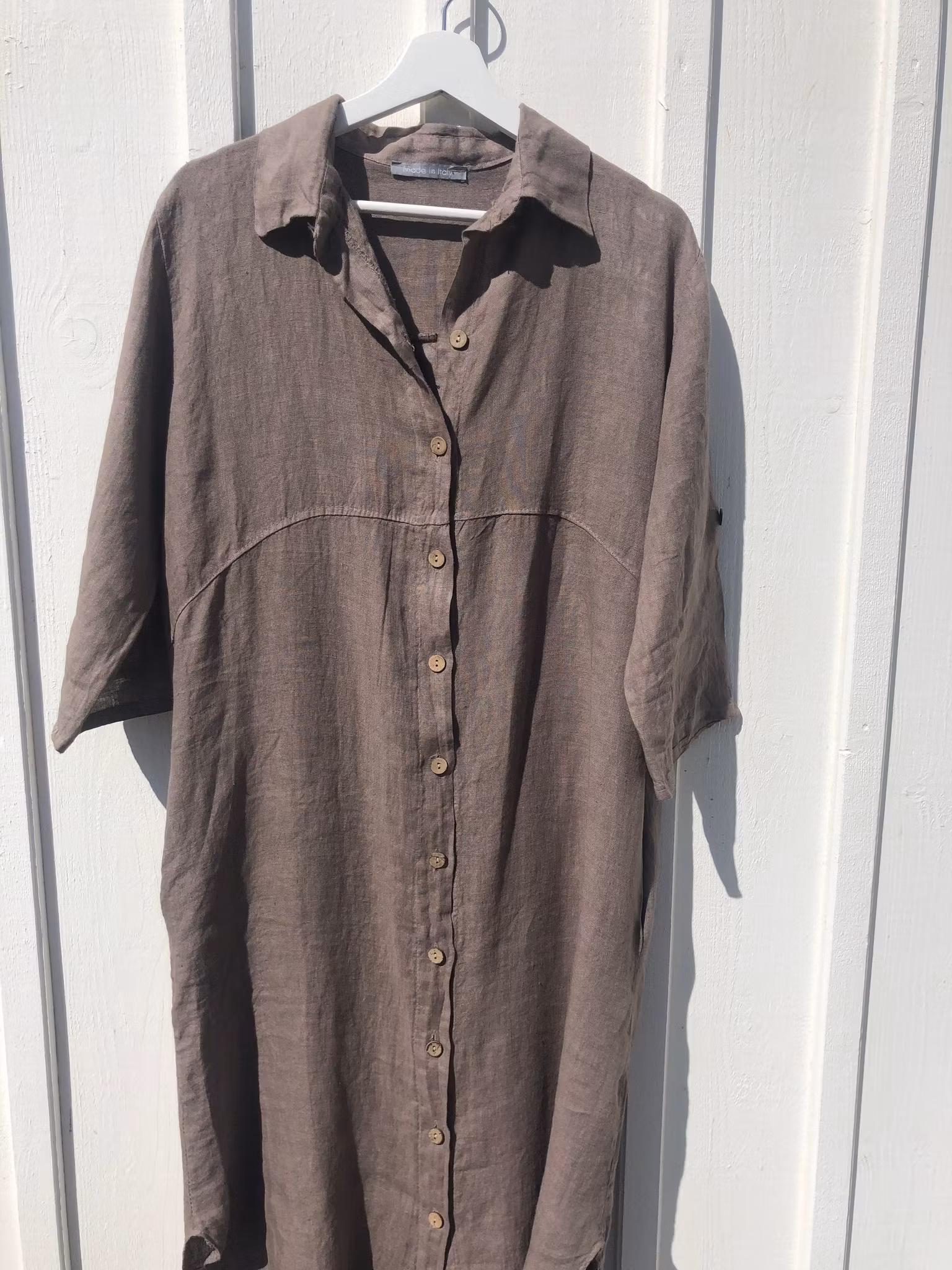 En ljuvlig jordfärgad linneklänning med knappar hela vägen. Som en storskjorta. Styla med ett skärp och ett långt halsband.