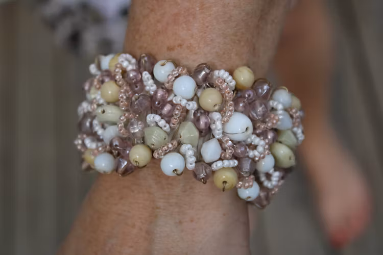 Vackert armband av pärlor fasta på sidentyg. Stängs med ett spänna på en kedja.